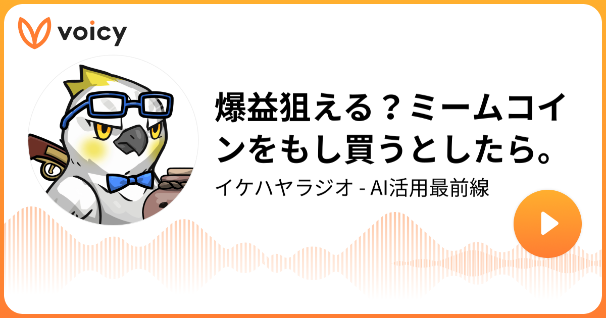 デジタルゴールド 未分類 X Facebook はてブ Pocket LINE コピー 2024.11.14 爆益狙える?ミームコインをもし買うとしたら。 | イケハヤ「イケハヤラジオ - AI活用最前線」/ Voicy - 音声プラットフォーム音声放送チャンネル「イケハヤ」の「爆益狙える?ミームコインをもし買うとしたら。(2024年11月14日放送)」。Voicy - 音声プラットフォーム